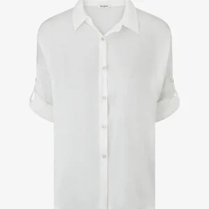 Blusa asimétrica nacarada de manga larga arremangable. – Blanco