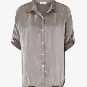 Blusa asimétrica nacarada de manga larga arremangable. – Marrón