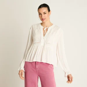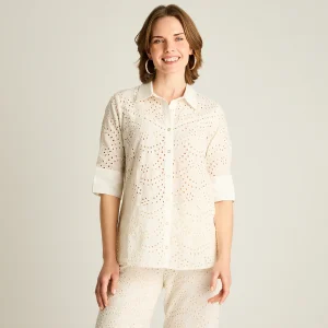 Blusa Crudo Manga 3/4 con Broderie y Escote Bordado