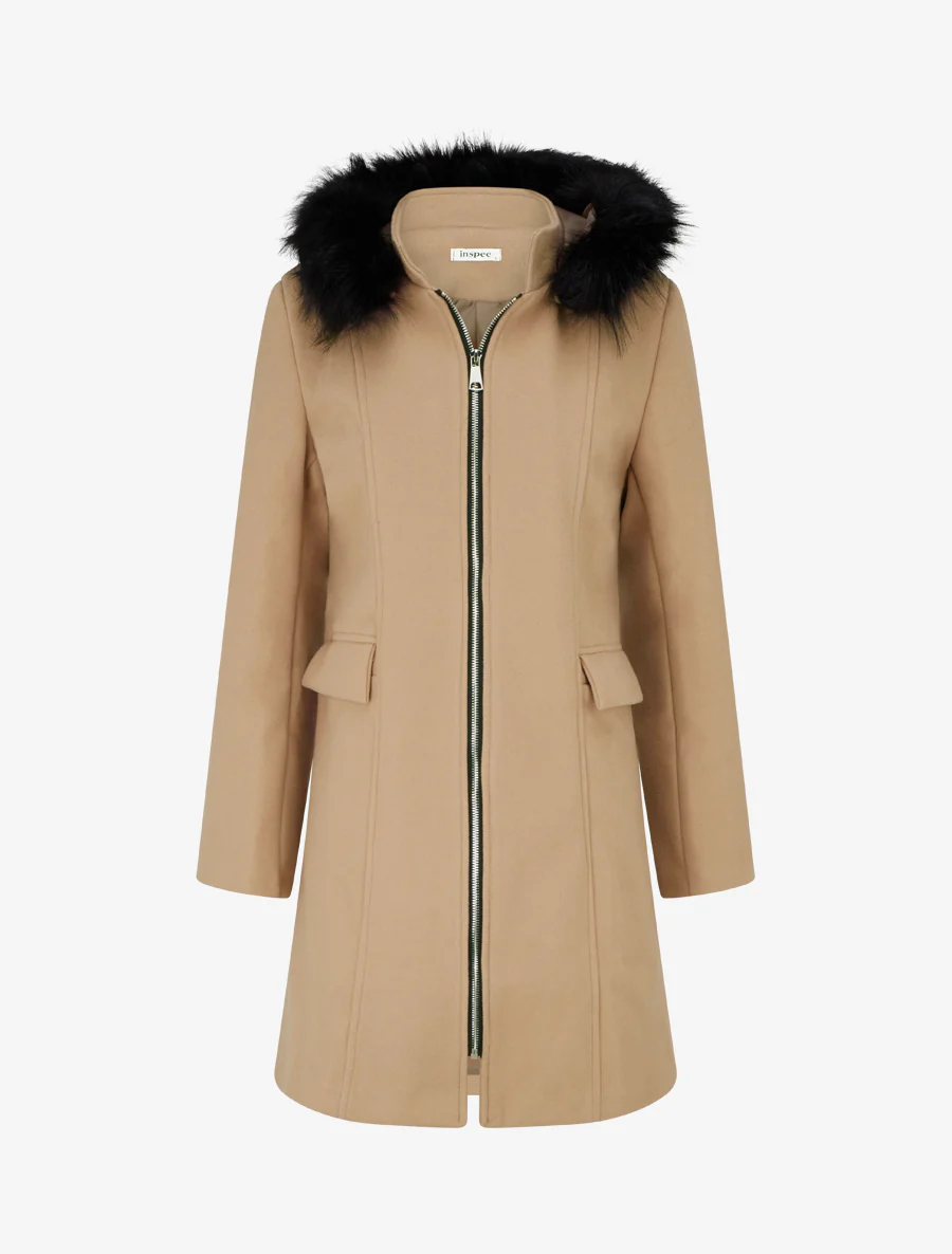 Abrigo largo con capucha y cremallera – Camello claro