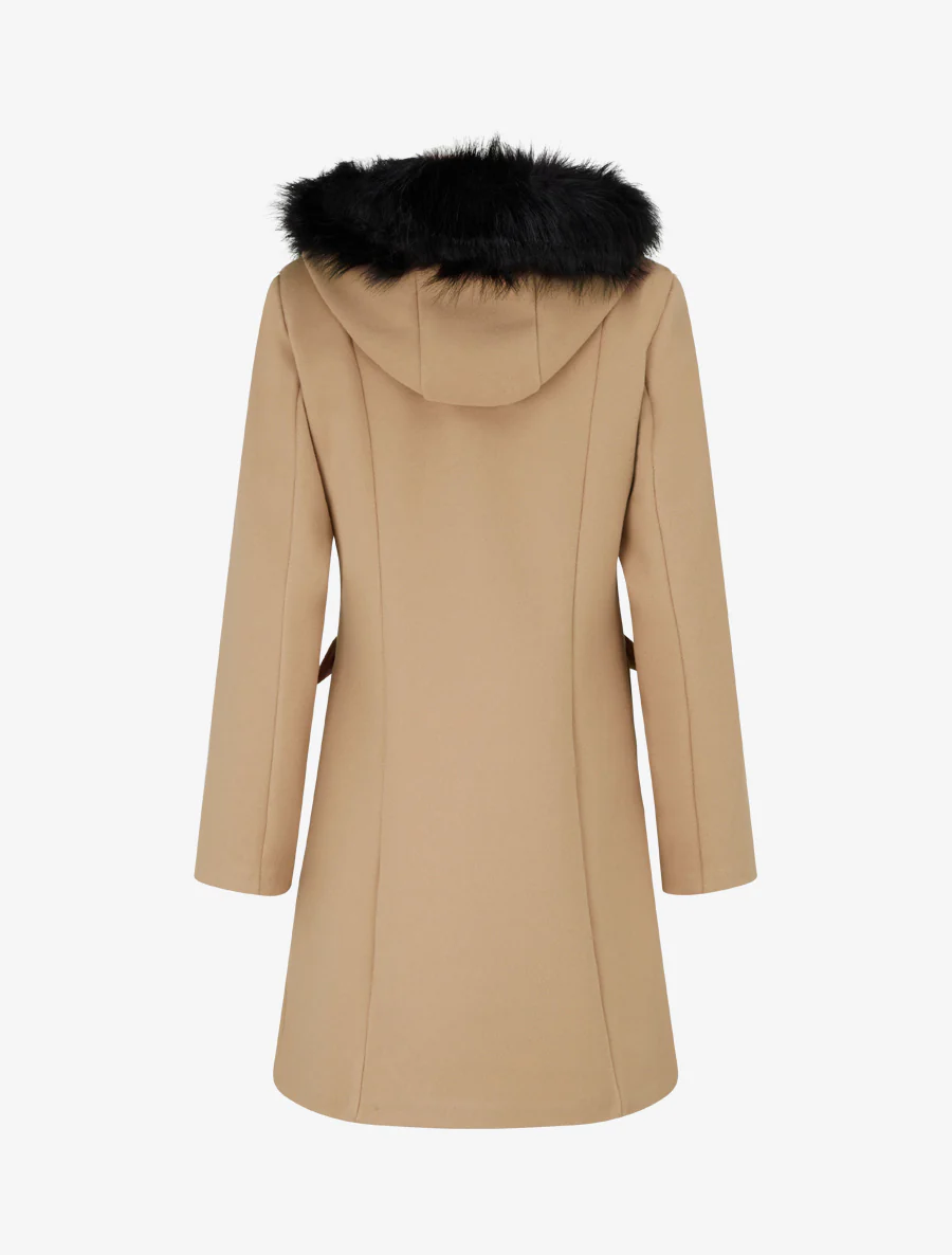 • Capucha desmontable adornada con piel sintética