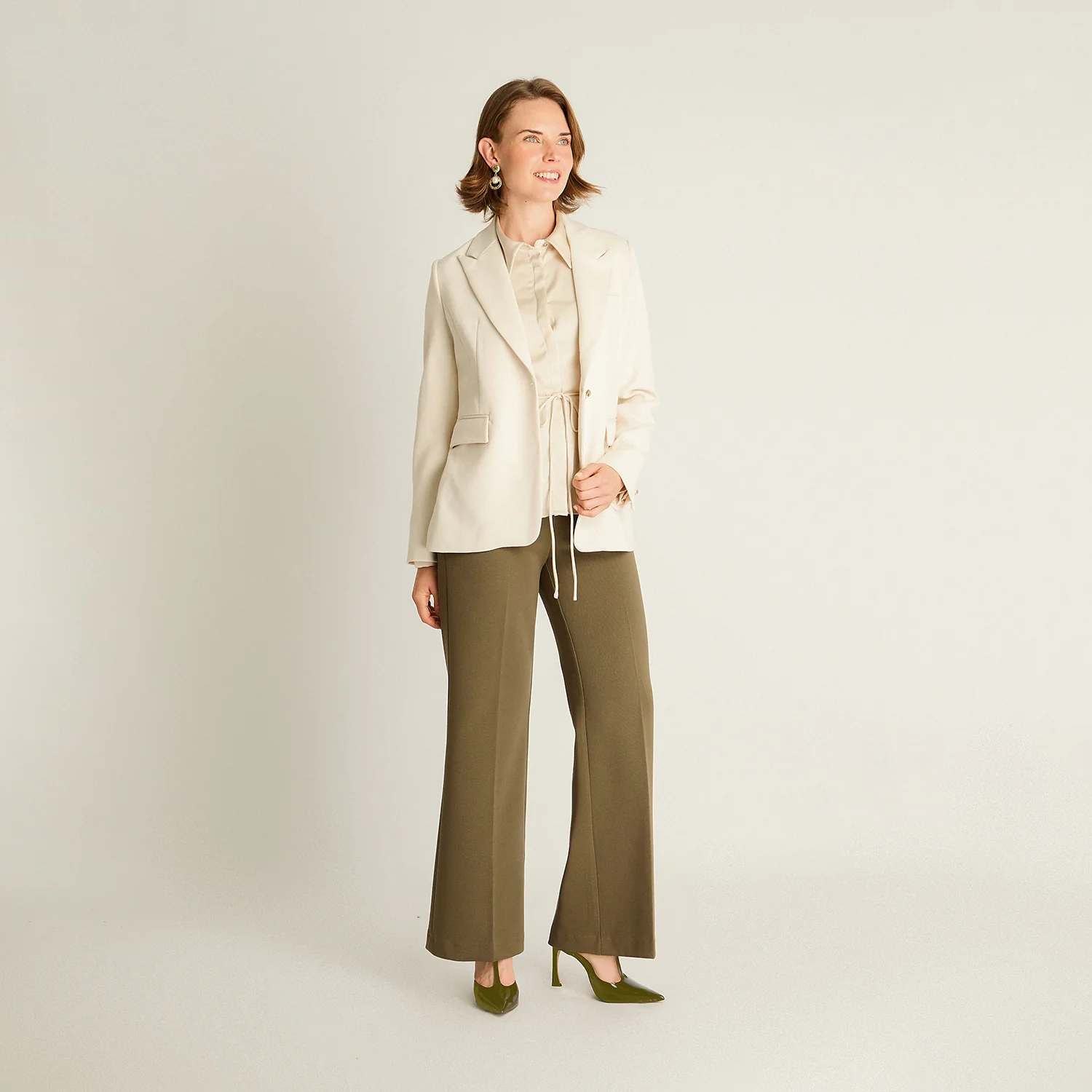 El blazer color arena de la colección Business Olive de Lorenzo di Pontti es una prenda pensada para mujeres que buscan estilo, estructura y comodidad en su día a día profesional. Confeccionado en una mezcla de 62% poliéster, 34% viscosa y 4% elastano, mantiene una silueta definida y pulida. Al ser no elasticado pero con forro completo, ofrece excelente caída y confort.