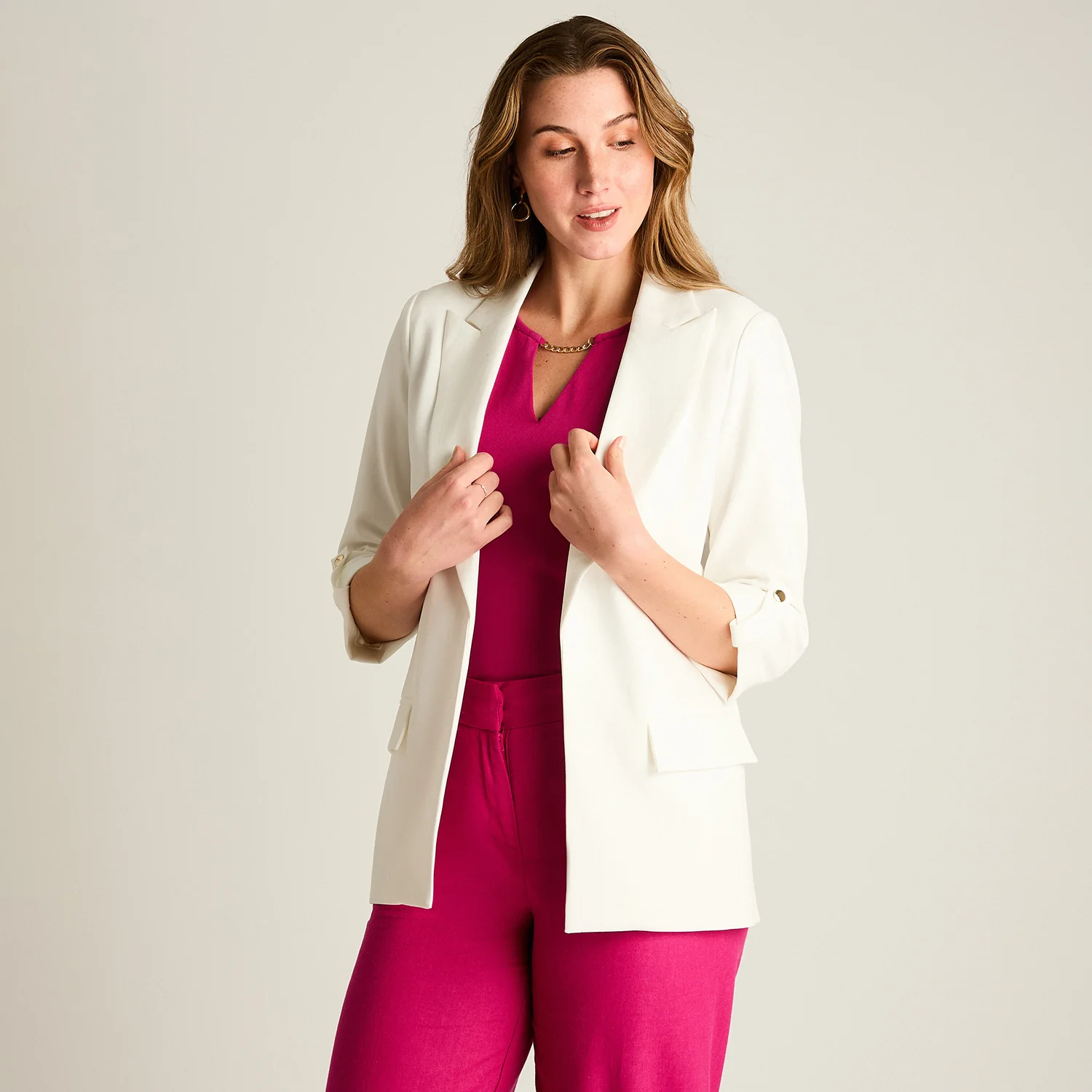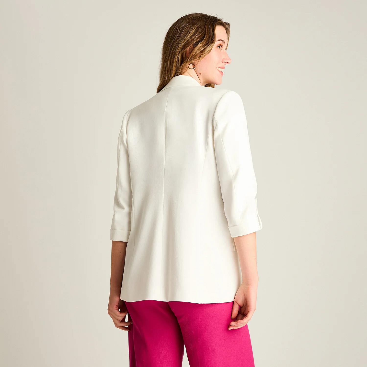 Este blazer en color crudo es un básico infalible para looks frescos y pulidos. Su diseño con mangas 3/4, calce normal y forro interior entrega una silueta estructurada pero cómoda, ideal para complementar tenidas de primavera y verano.