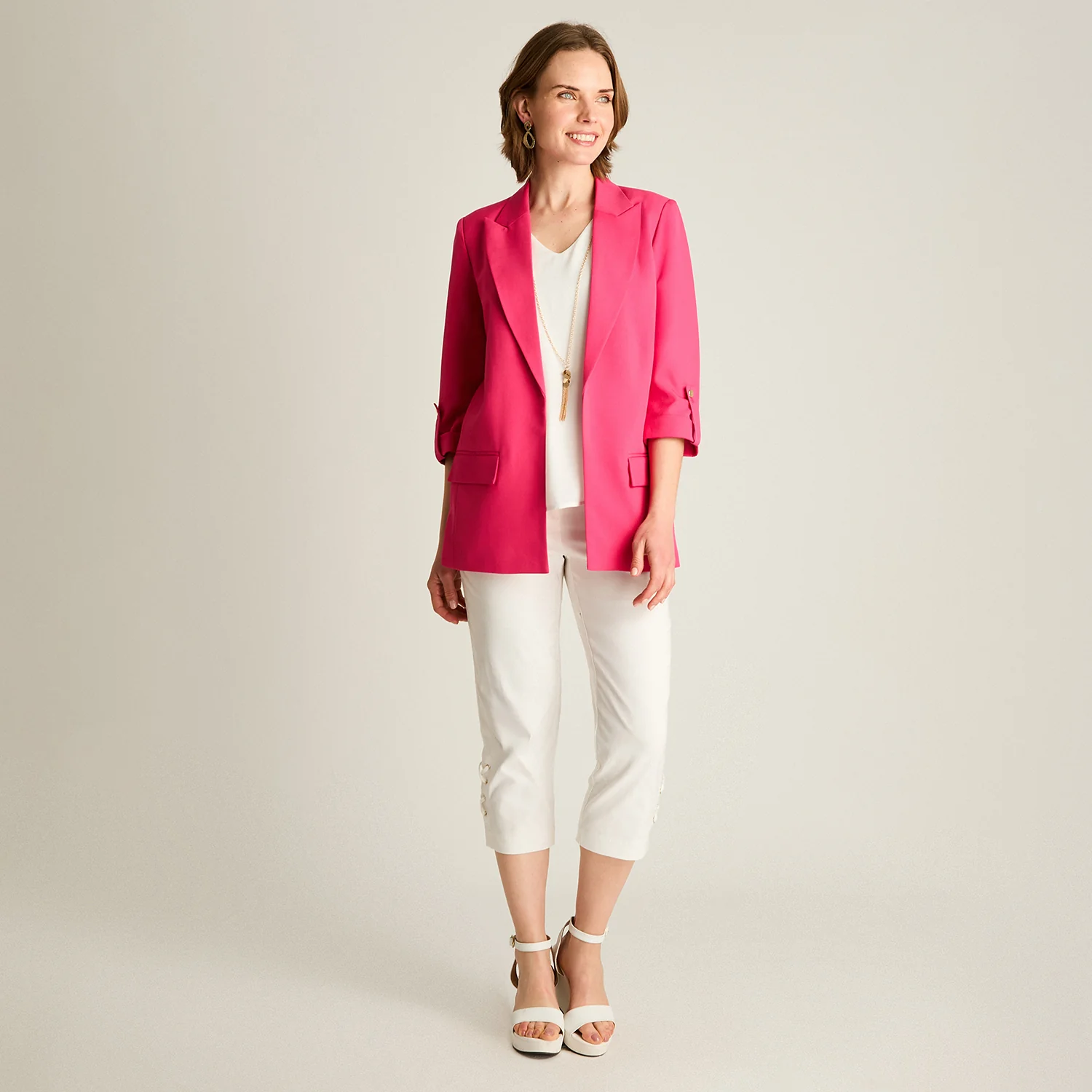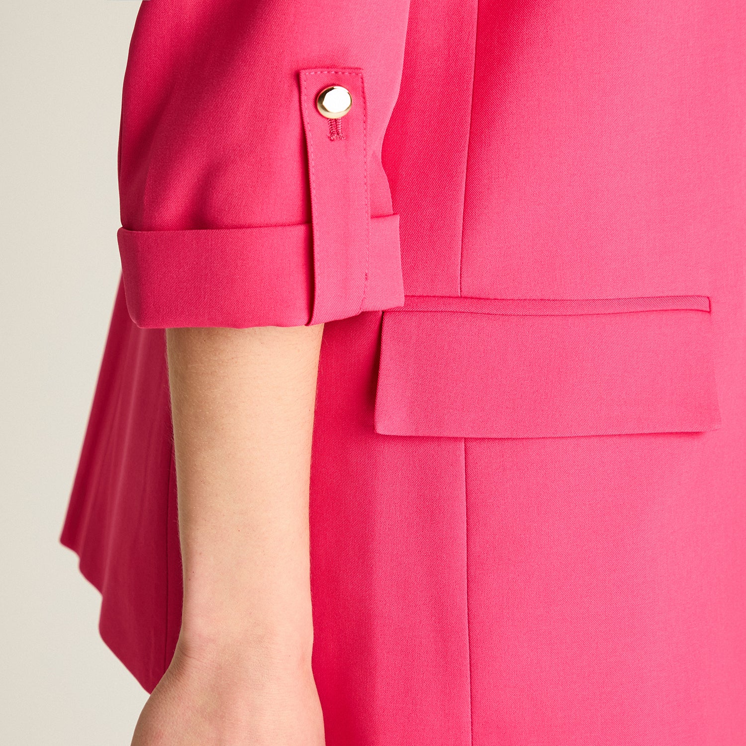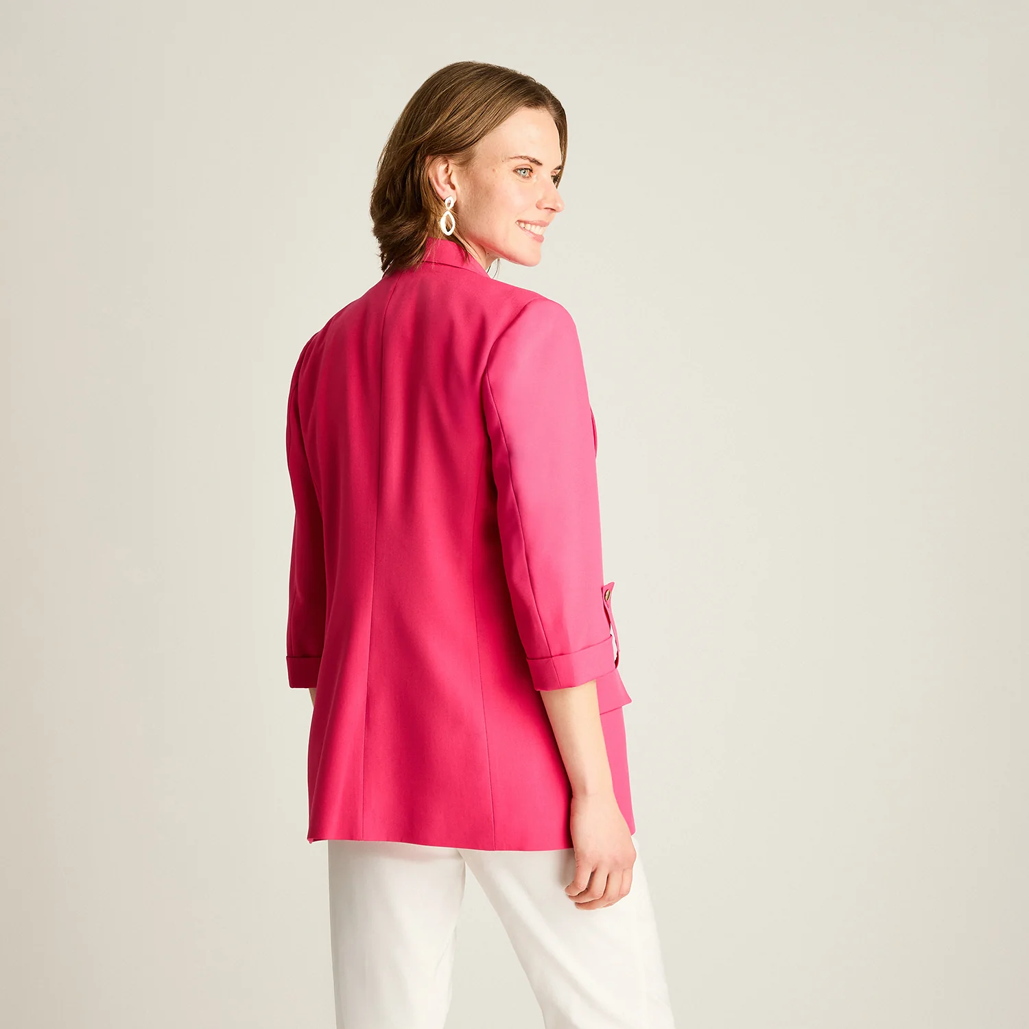 Este blazer fucsia con manga 3/4 es la prenda perfecta para dar color y sofisticación a tus looks de temporada. Diseñado con calce normal y tejido no elastizado, ofrece una silueta pulida sin sacrificar comodidad. Su forro interior aporta estructura y una mejor caída.