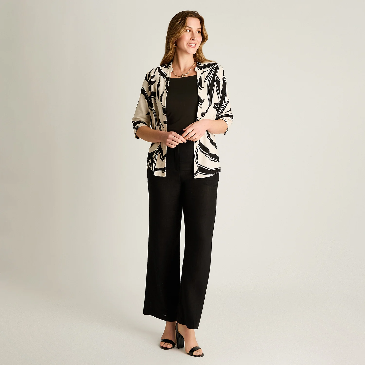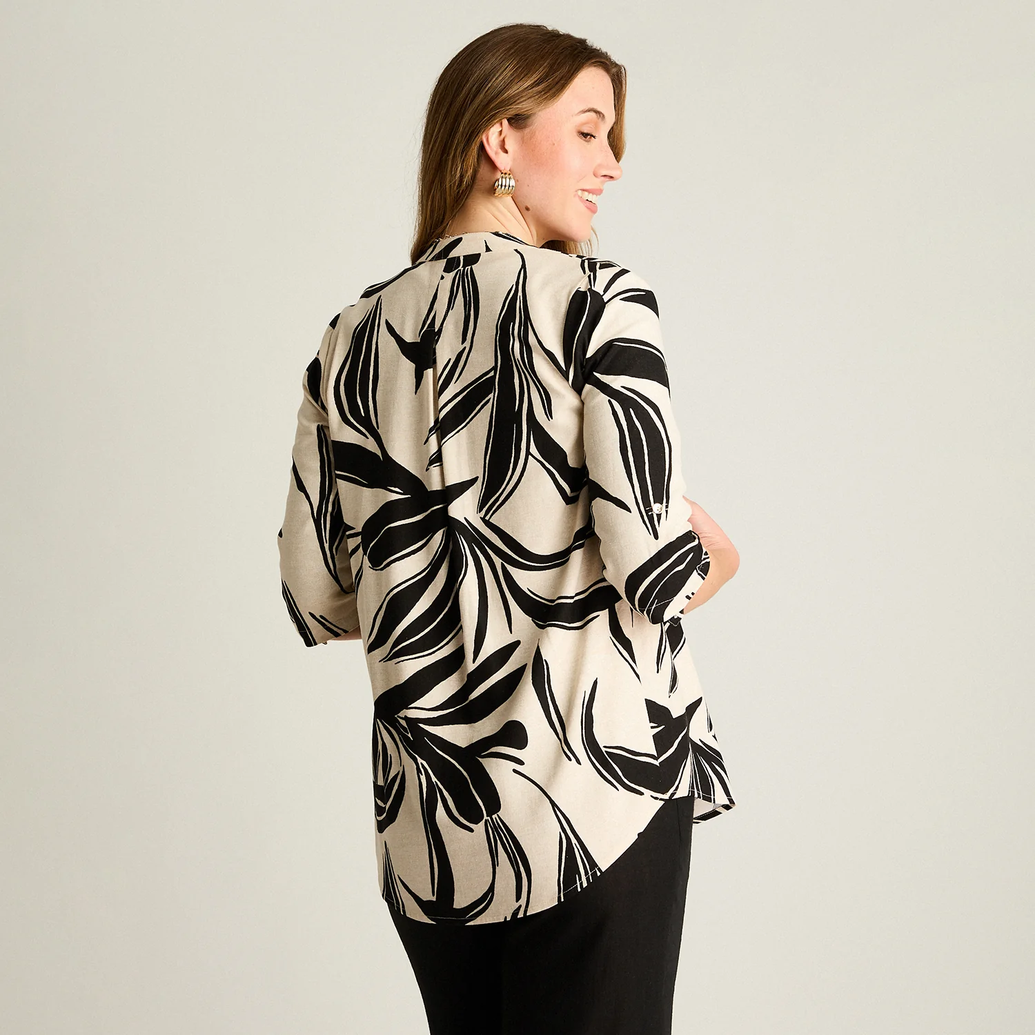 Ligera y fresca, esta blusa mezcla lino–viscosa suma un aire natural y elegante. El estampado botánico en negro realza el tono arena y su calce normal ofrece comodidad para días cálidos, desde looks casuales hasta más arreglados.