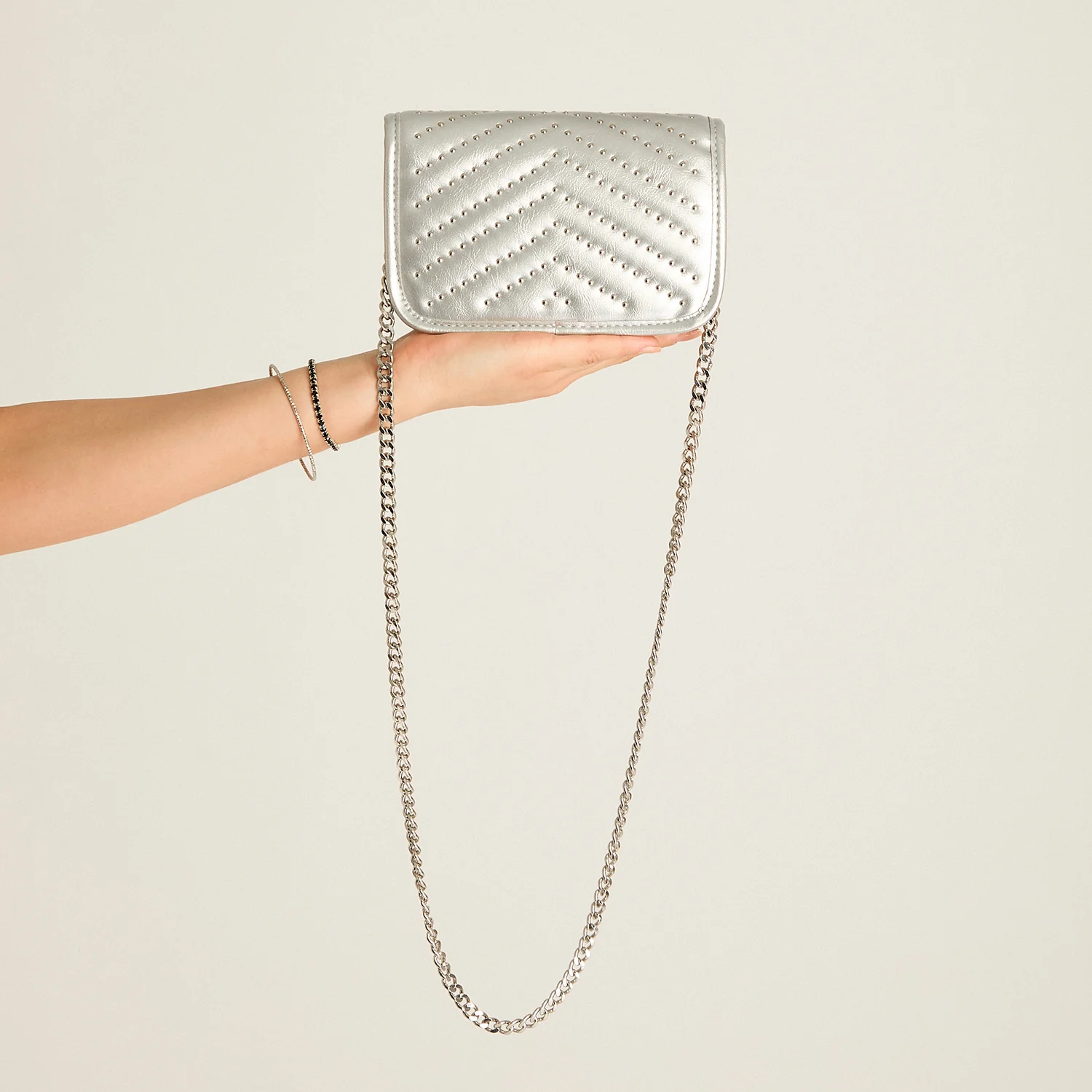 Cartera en color plata con diseño acolchado y aplicaciones metálicas al frente, ideal para un look moderno y elegante. Incluye correa tipo cadena que permite llevarla cruzada o al hombro, y compartimento interior con forro para mantener tus objetos personales organizados.