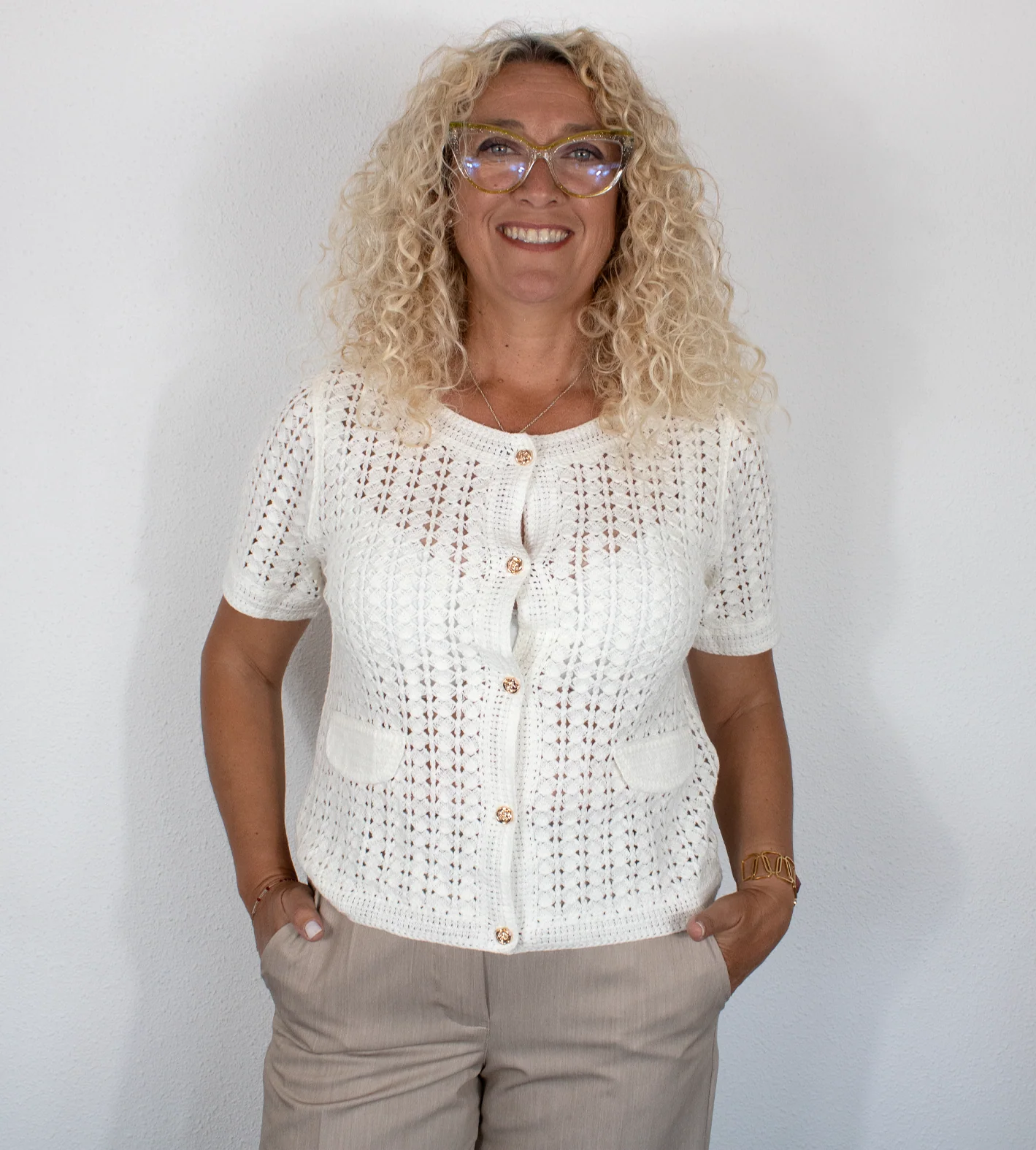 Este elegante jersey de mujer, en color blanco, está confeccionada en un tejido de punto calado que aporta un toque sofisticado y ligero. Su diseño de manga corta incorpora un delicado patrón de pequeños rombos, lo que la convierte en una prenda fresca y versátil. En la parte frontal, destacan una fila de botones dorados y un pequeño bolsillo decorativo, añadiendo un detalle chic y moderno. Perfecta para un look casual o más refinado según la combinación elegida.