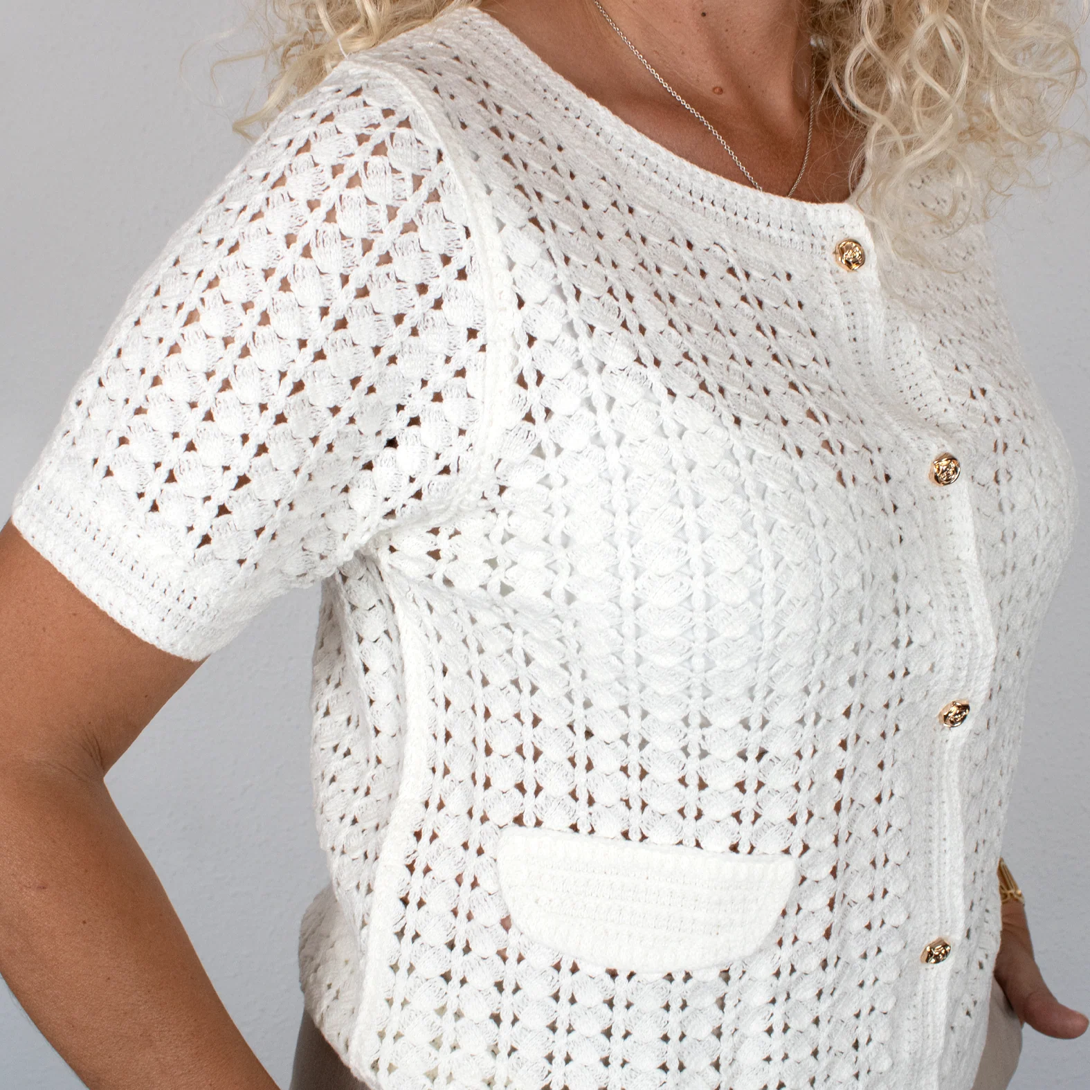 Sé el primero en valorar “Jersey en punto calado con botones dorados”