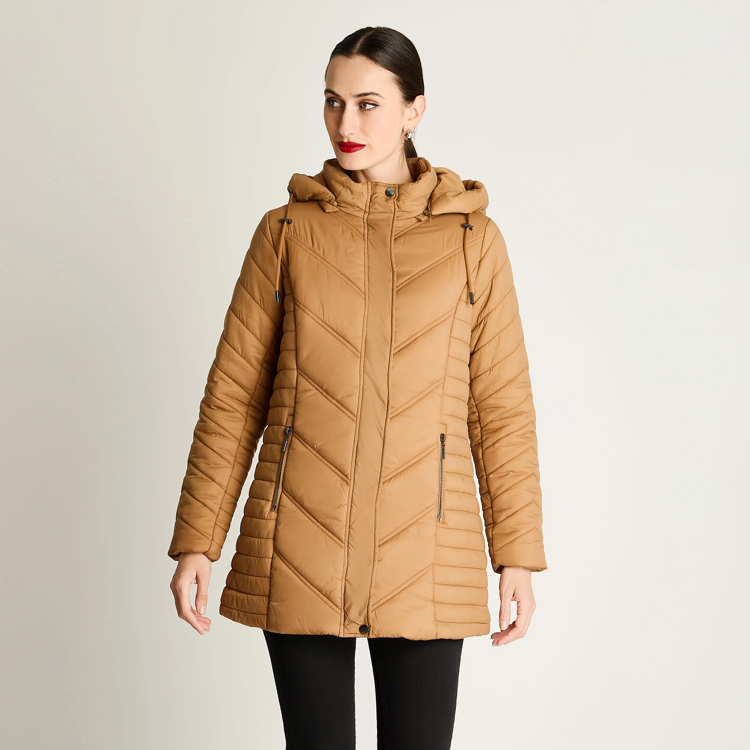 Parka larga camel con cierre frontal y gorro desmontable– Abrígate con estilo y comodidad todos los días