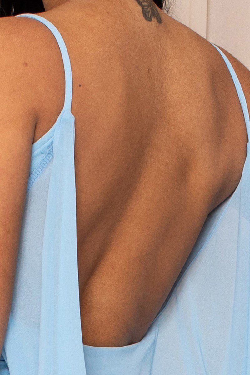 Vestido largo de fiesta color negro con escote en v , con tirantes delgados y descubierto de la espalda.